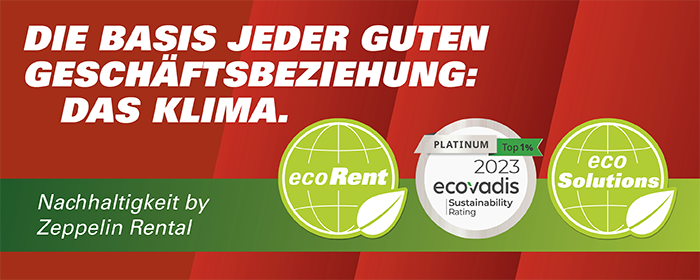 Bereits 2011 haben wir mit der Einführung der Umweltmarke ecoRent ein richtungsweisendes Zeichen im Markt gesetzt und unser Portfolio seither kontinuierlich ausgebaut. Heute bieten wir Ihnen neben modernsten umweltfreundlichen und energieeffizienten Technologien in der Vermietung zusätzlich vielfältigste Lösungen zur Optimierung der Effizienz und Nachhaltigkeit bei Ihren Projekten. Hier finden Sie einen Überblick. Sollten Sie zusätzlichen Bedarf an ökologisch nachhaltigen Leistungen haben, nehmen Sie gerne unter sustainability-rental(at)zeppelin.com Kontakt auf.